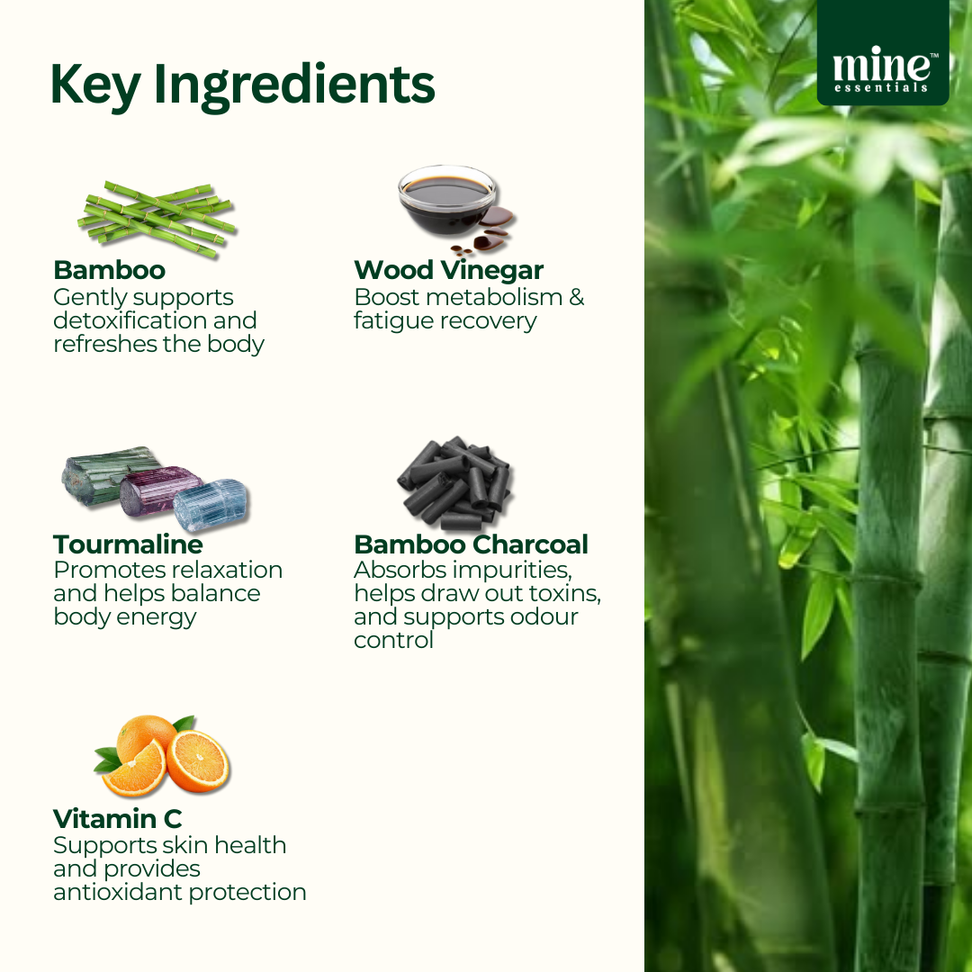 Bamboo Extract, Mangrove Wood Vinegar, Vitamin C, Bamboo Charcoal, Tourmaline, Chitosan, Silica, Dextrin