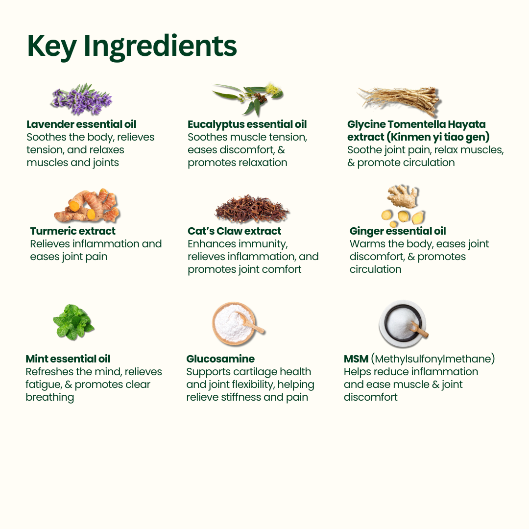 Lavender Essential Oil, Eucalyptus Essential Oil, Ginger Essential Oil, Glycine Tomentella Hayata Extract, Cat’s Claw Extract, Mint Essential Oil, Glucosamine, MSM (Methylsulfonylmethane), Purified Water, Emulsifier.
