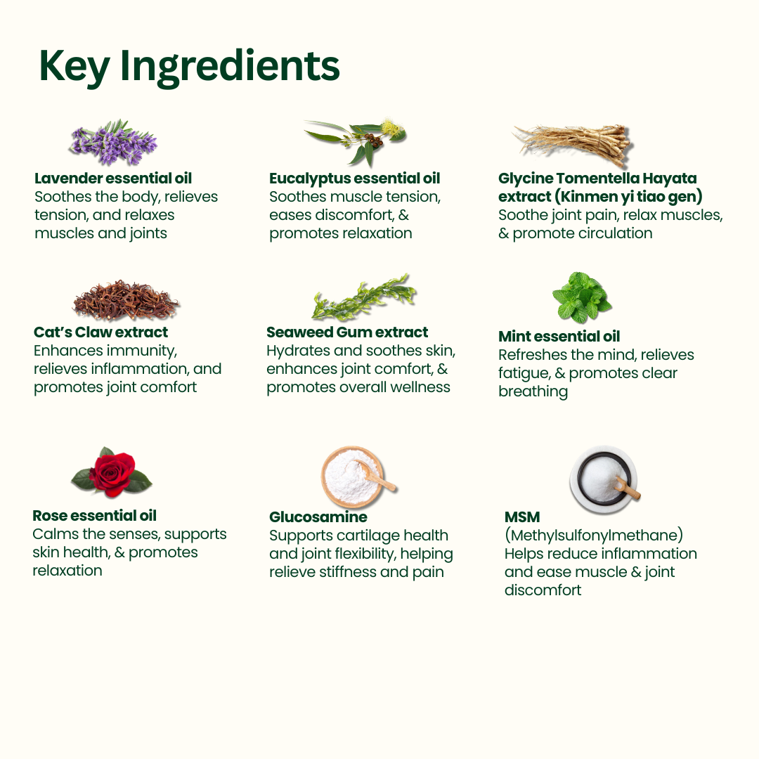 Lavender Essential Oil, Turmeric Extract, Glycine Tomentella Hayata Extract, Cat’s Claw Extract, Eucalyptus Essential Oil, Seaweed Gum Extract, Mint Essential Oil, Rose Essential Oil, Glucosamine, MSM (Methylsulfonylmethane), Pure Water.