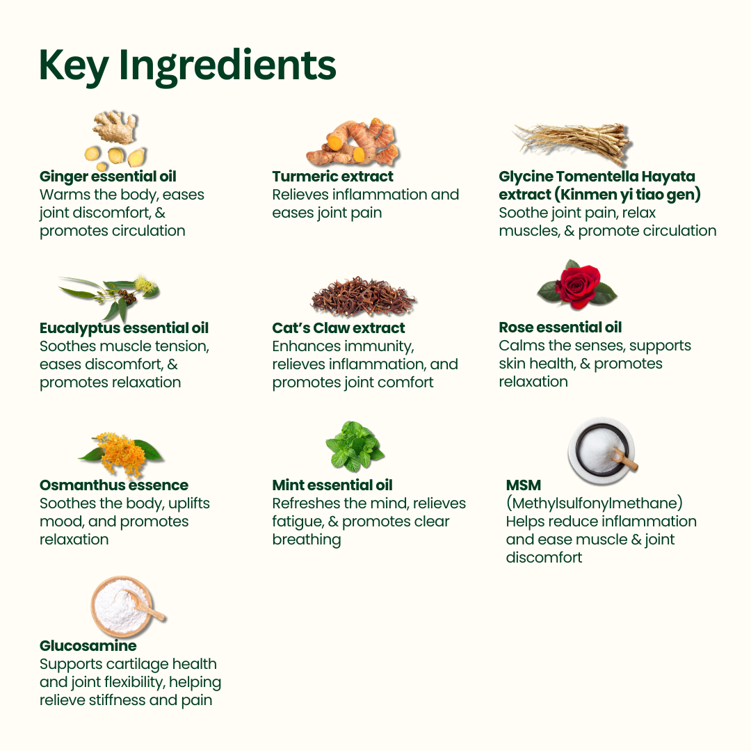 Ginger Essential Oil, Turmeric Extract, Glycine Tomentella Hayata Extract, Cat’s Claw Extract, Eucalyptus Essential Oil, Osmanthus Essence, Rose Essential Oil, Mint Essential Oil, Glucosamine, MSM (Methylsulfonylmethane), Purified Water, Emulsifier.