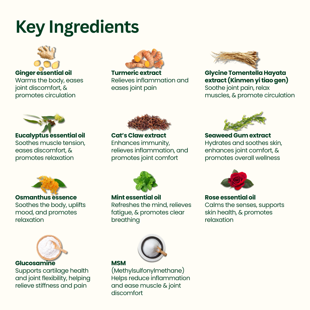 Ginger Essential Oil, Turmeric Extract, Glycine Tomentella Hayata Extract, Cat’s Claw Extract, Eucalyptus Essential Oil, Seaweed Gum Extract, Osmanthus Essential Oil, Rose Essential Oil, Mint Essential Oil, Glucosamine, MSM (Methylsulfonylmethane), Pure Water.